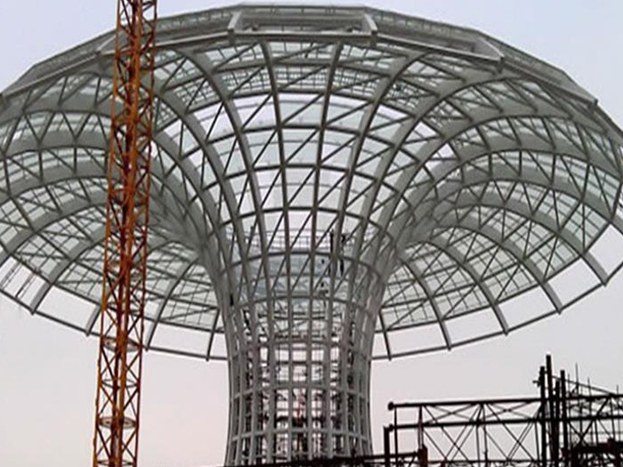 二、球形网架结构因其结构新颖,受力合理,自重轻、用钢量低等优点。如大型体育场馆球形绵阳螺栓球网架、公共场馆球形网架、电厂绵阳螺栓球网架、水泥工业球形网架、仓储物流球形网架、绵阳干煤棚工业球形网架、绵阳收费站绵阳加油站球形网架、展览中心、影剧院、商场、航站楼、候车厅、工厂绵阳车间、仓库、电视塔等球形螺栓球节点网架。国内球形网架结构主要分为:绵阳焊接球节点网架及螺栓球节点网架两种。螺栓球节点网架其构件工厂内加工量较大,现场安装便捷,适用于现场工期紧,绵阳施工条件、用电量受制约,网架形状复杂、绵阳杆件定位困难的异形结构。螺栓球节点球形网架系统基本由绵阳杆件、螺栓球、支撑支座等组成。按照节点形式可分为交叉绵阳桁架体系、四角锥体系、三角锥体系等。支撑方式多为固定支座支撑。对于大面积、大跨度及有特殊受力或伸缩要求的网架结构可采用橡胶支座、滑移支座、球铰支座等支撑形式,以满足结构自身的受力稳定、均衡,便于内力释放等设计要求。